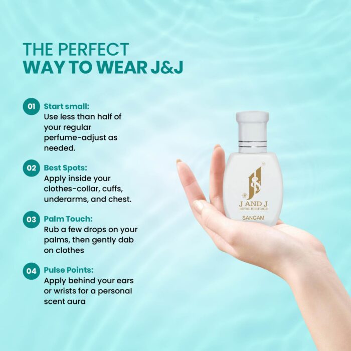 Start with less than half the quantity of your traditional perfume or attar and then increase gradually. Apply it on the inside of your clothes { collar, underarm, upper front facing and cuff etc.}. You can also apply by rubbing a few drops on your palm and gently dabbing on your clothes or by rubbing a few drops behind your ears or on your wrist.